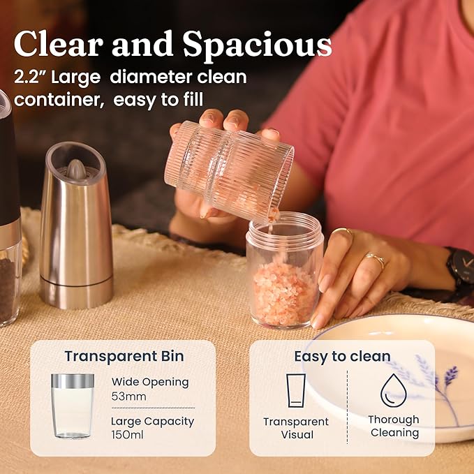 GRAVITY SENSOR AUTOMATIC OPERATION - This electric pepper grinder with gravity sensor offers effortless one-hand use—you don’t need to press the button, simply flip to grind and use it as a spice shaker. Our automatic electric grinder is a convenient battery operated pepper grinder and stylish electric salt and pepper shaker.
